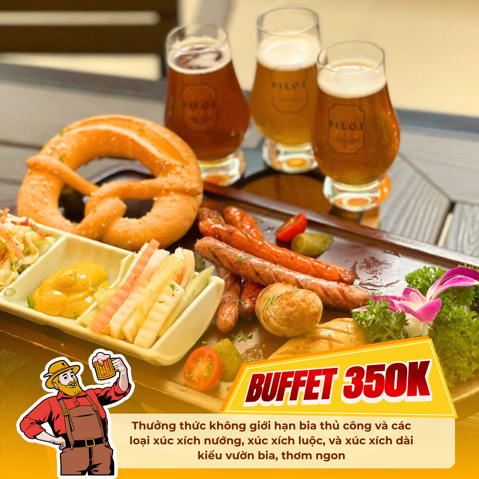Buffet 350k: Thưởng thức không giới hạn bia thủ công và các loại xúc xích nướng, xúc xích luộc, và xúc xích dài kiểu vườn bia, thơm ngon.